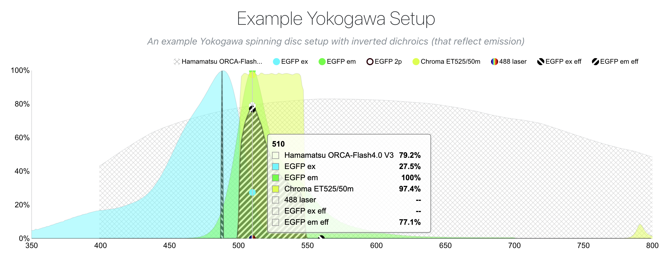 Here, for example, FPbase allows one to design an experiment given constraints such as fluorophore, camera sensitivity, filters, and other optical elements. By changing filters, for example, we can see how signal changes
