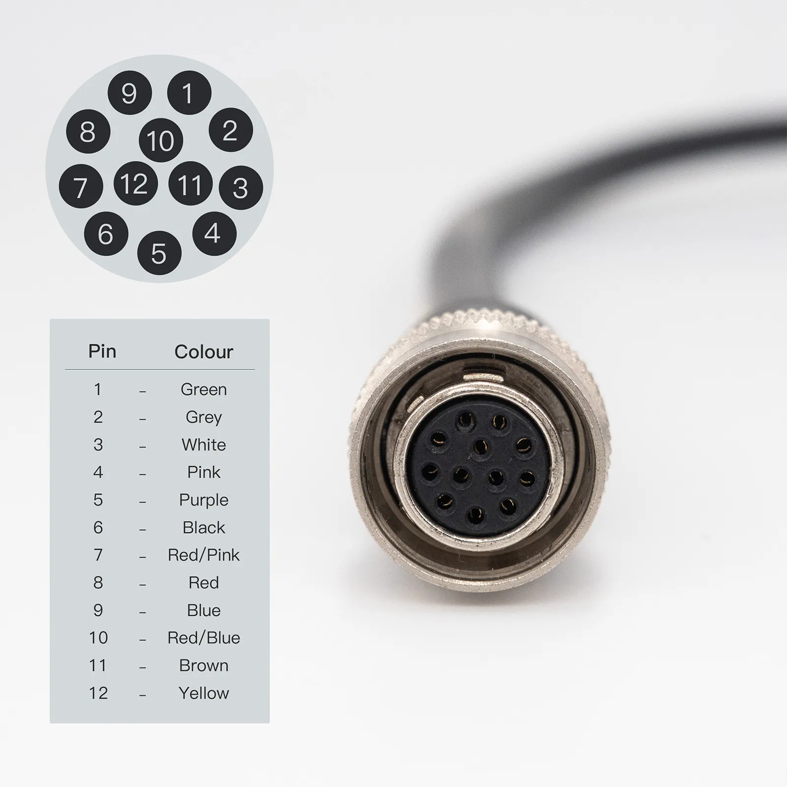 Pins on the connector are providing different signals: ground voltage, input (hardware trigger), output (exposure) or other signals. For example, if voltage between ground pin and input trigger pin reaches “HIGH” level, then the camera will perform exposure. Each cables has different correspondence between pin number and color of individual wires. Depending on the software setting of the camera, the exposure duration will be defined from user interface or will last as long as the voltage is “HIGH”.