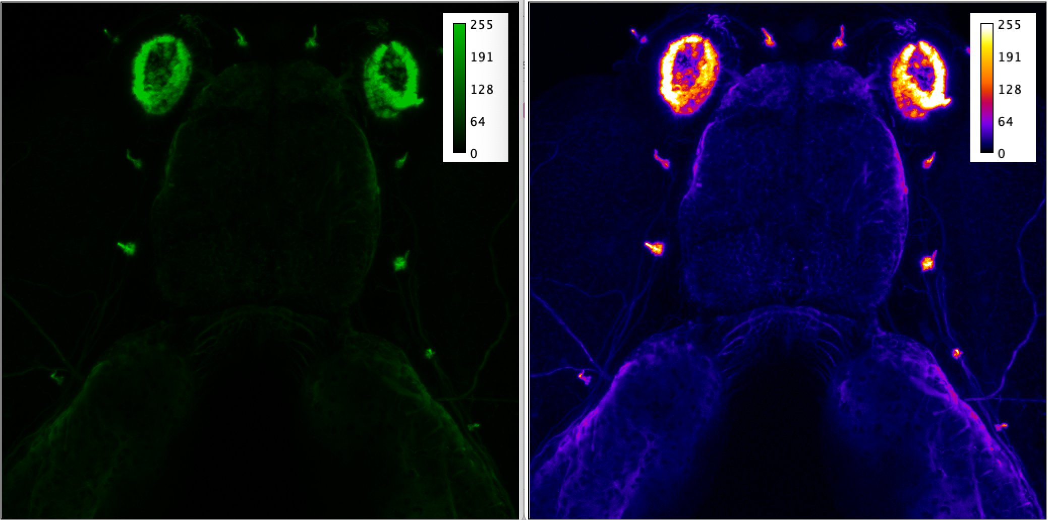 Here we compare Green colormap with Fire colormap (processed in FIJI/ImageJ) on the same dataset with the same range of intensities: